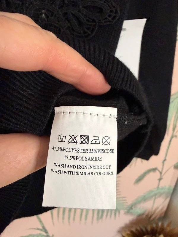 Black fine knit jumper with crochet lace panel detailing to the front. Features a classic round neckline, long sleeves and ribbed cuffs and hem. Soft, lightweight knit with a flattering fitted shape – perfect for everyday wear or dressing up for evenings. Elegant and versatile wardrobe staple.