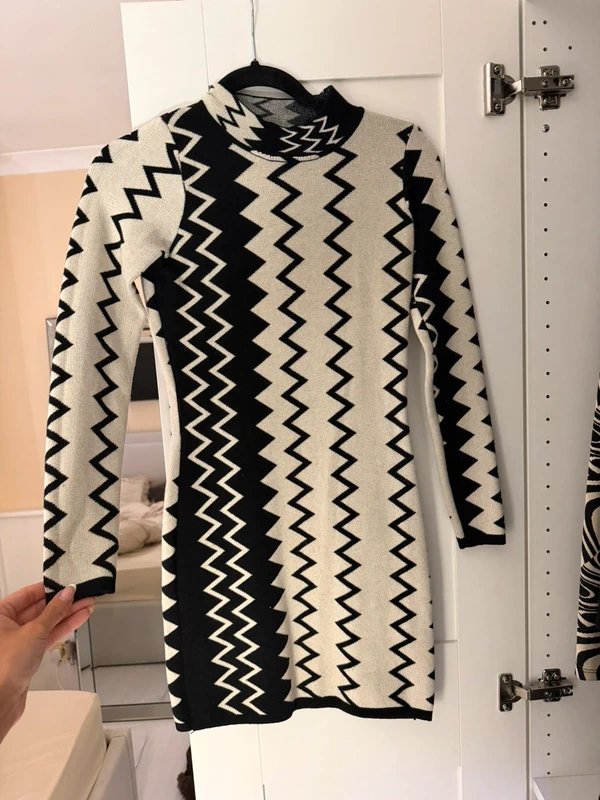 This zig zag knit dress by Never Fully Dressed comes in a stunning cream and black combination. Featuring a crew neck and long sleeves, this dress is perfect for any casual occasion.