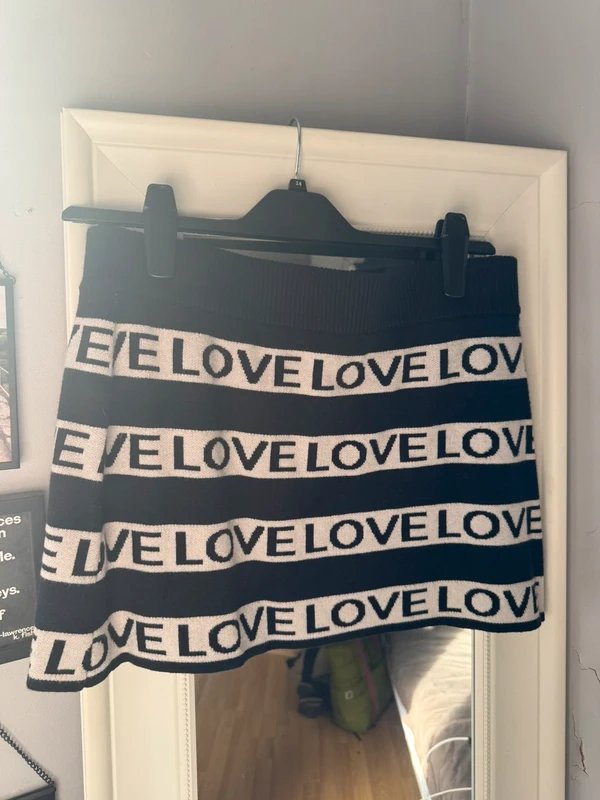 The Never Fully Dressed Black and White Love Print Knitted Mini Skirt is available in sizes M.