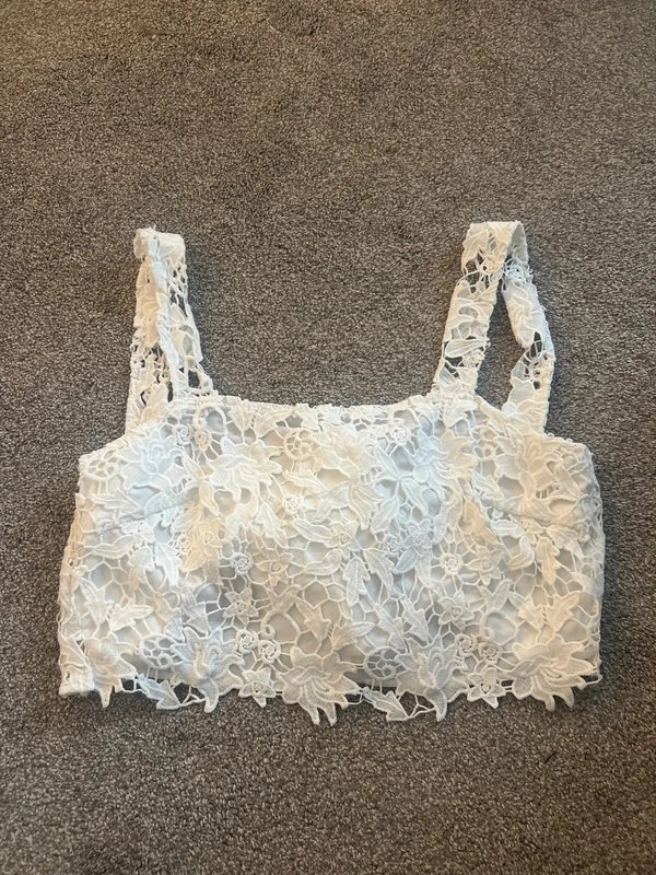 The Never Fully Dressed White Lace Crop Top is available in sizes M.
