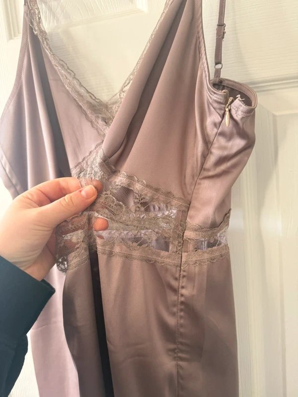 This lace cut-out dress is perfect for a special occasion. Featuring lace detail on the front and shoulders, it is a stunning piece that adds a touch of elegance. The mauve/metallic purple color gives it a unique and sophisticated look.