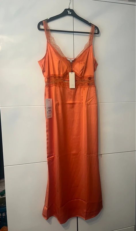 Orange Lace Dress — the must-have occasion dress for wedding guests, evening events, dinner parties. Designed in vibrant orange, this strapless dress features lace detailing, a sheer bodycon silhouette for a flattering fit. Crafted from lightweight sheer lace with subtle shimmer, it catches the light beautifully. Includes a full-length jersey slip lining for comfort and coverage.