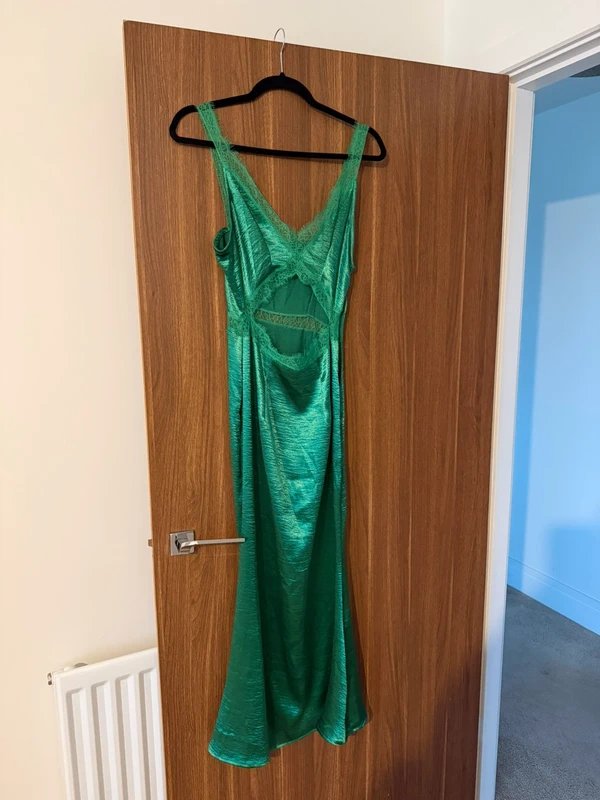 A stunning emerald maxi slip dress featuring lace cut out detailing. The sheer fabric adds a touch of elegance and sophistication, perfect for a special occasion or evening out.