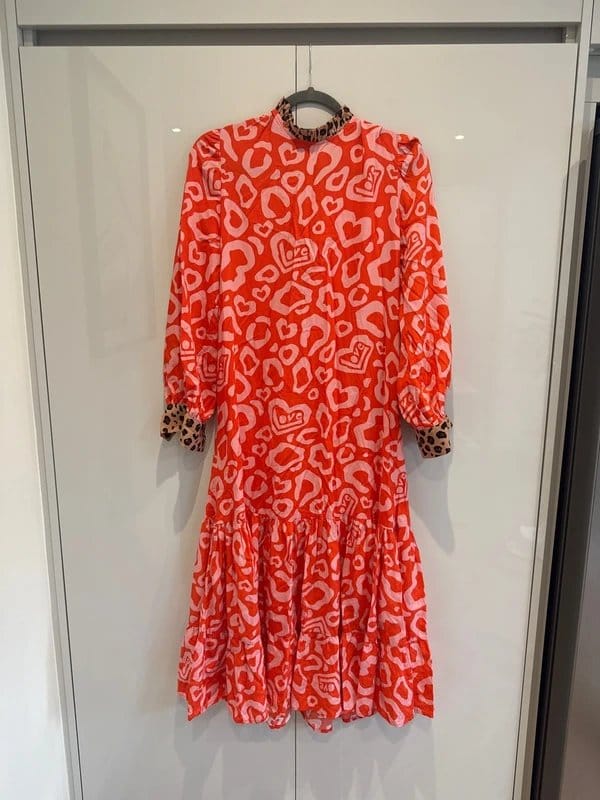 Bold Coral leopard print dress with a playful geometric pattern. Features a round neckline, long sleeves, and a full skirt with a tiered hemline. Perfect for a statement look at any event.