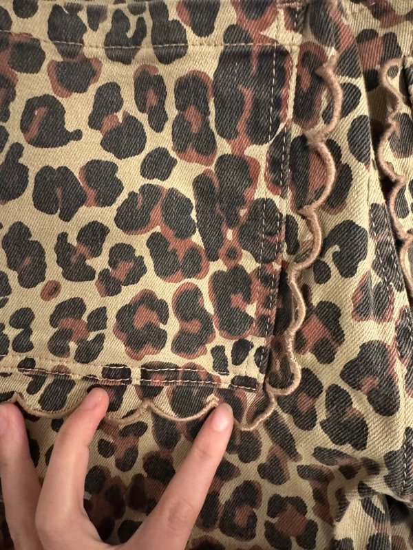 These leopard print jeans offer a unique and eye-catching look. Featuring a scalloped detail around the pockets, they add a touch of flair to your outfit.