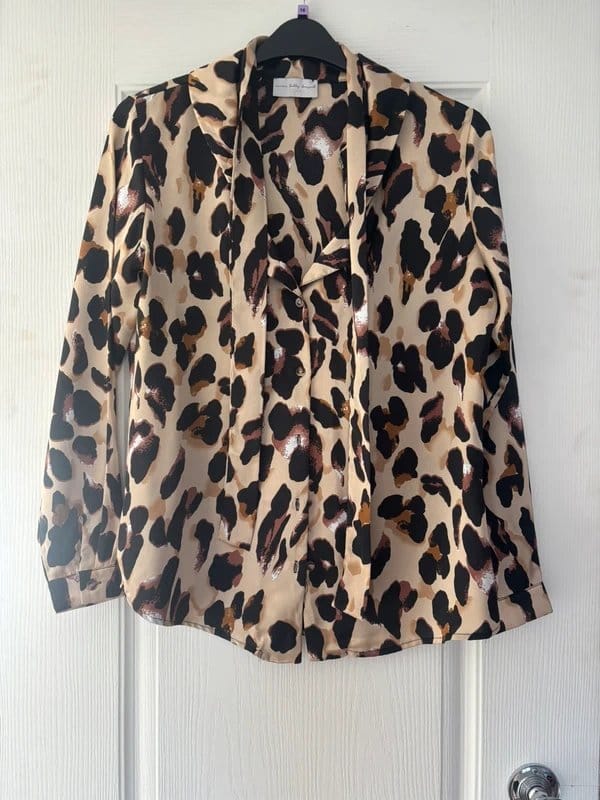This leopard print shirt by Never Fully Dressed features a bold animal print in beige and black. It has a tie-front neckline and long sleeves, making it a versatile piece for various occasions.