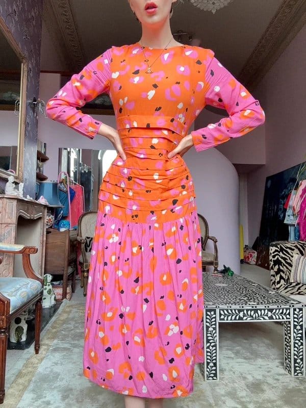 Vibrant pink leopard print summer dress from Never Fully Dressed. Features a fun and flattering silhouette with a gathered waist and long sleeves. Perfect for summer, holidays, or special occasions.
