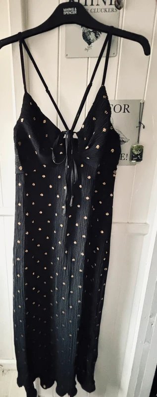 Stunning Never Fully Dressed multi spot plisse dress in black. Features spaghetti straps that can be worn in various ways, a crossover back, and a keyhole to the front. Perfect for any occasion, dress up with heels or dress down with trainers.