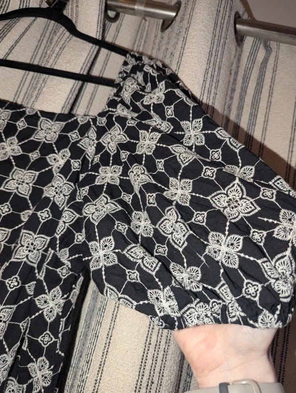 This Never Fully Dressed mini dress features an embroidery pattern in black and cream. It has a fitted shape that is really flattering, with a square neck and puff sleeves. The dress has a zipper back closure. Perfect for size 16.