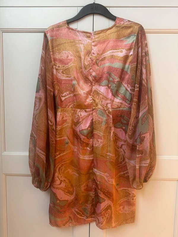 This mini dress by Never Fully Dressed features a swirly pattern and is crafted from satin. The chiffon balloon sleeves add a touch of elegance, making it perfect for a variety of occasions. The dress is in excellent condition and has been worn only once.