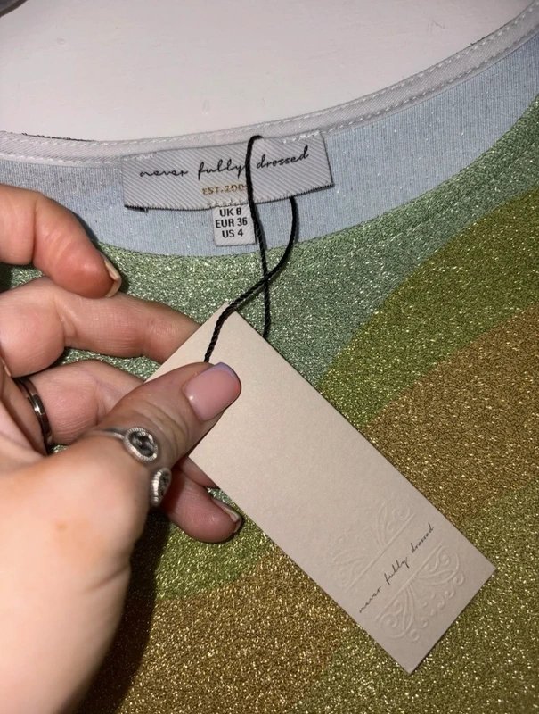 The Never Fully Dressed Multi Coloured Glitter Midi Dress is available in sizes S.