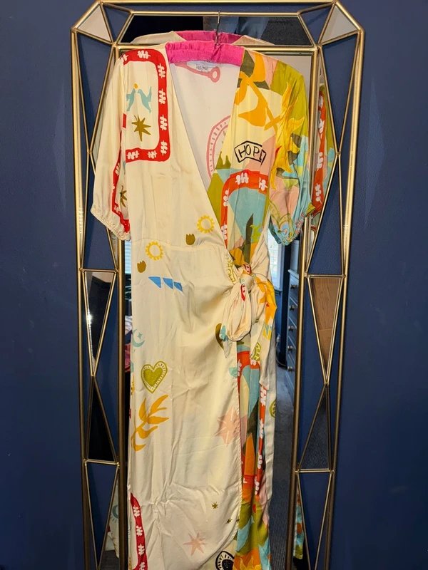 Beautiful Never Fully Dressed Multi Vienna Sundazed Wrap Dress in a lovely silky material. It can be worn several ways, making it a truly stunning and versatile addition to any wardrobe.