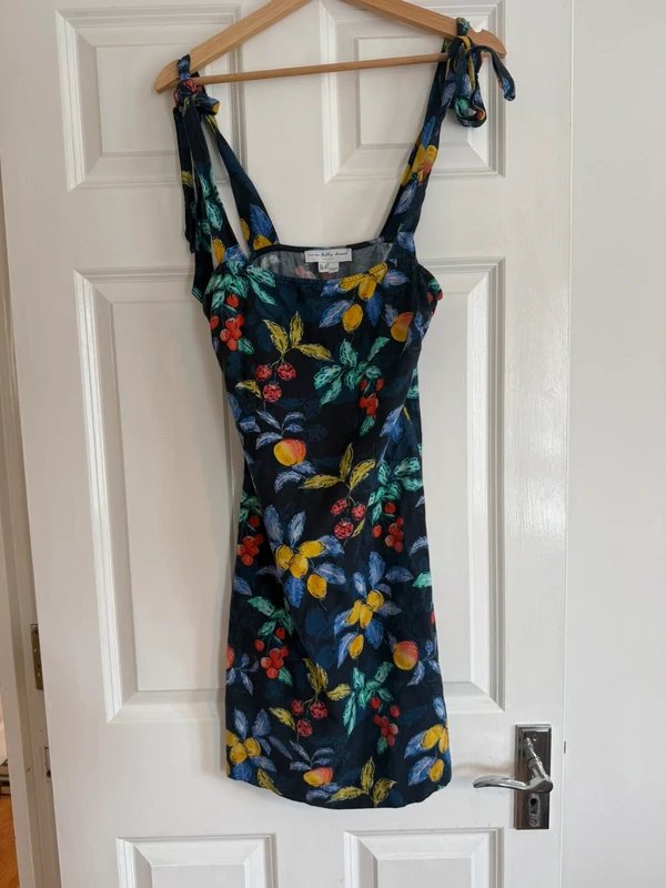 Adorned with a fun, colourful fruit pattern, this navy dress features shoulder ties for a playful touch. Perfect for spring and summer occasions, it's crafted for a flattering fit.