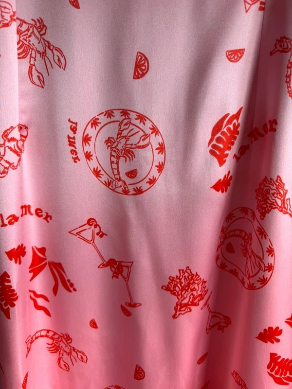 This Never Fully Dressed Midi Occasion Dress features a V-neck and short puff sleeves. Made with satin pink with red La Mer pattern, it boasts a flattering cut perfect for special occasions.