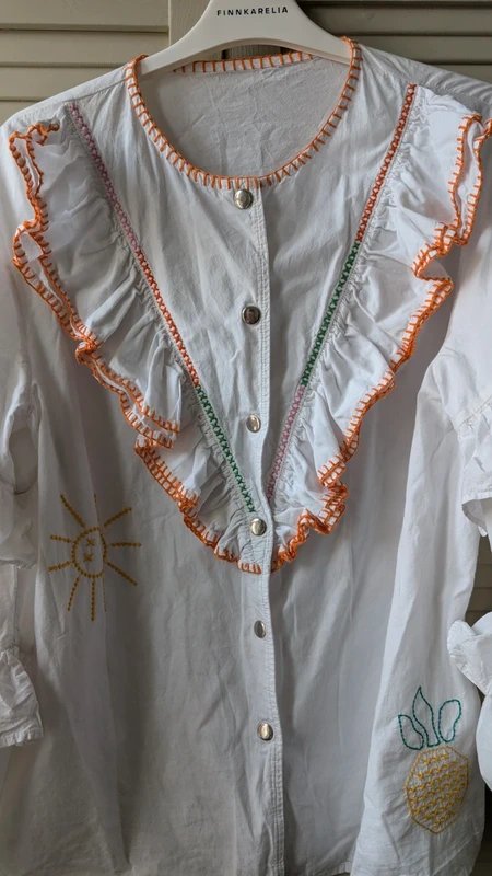 Super stylish Never Fully Dress shirt with embroidered details, puff sleeves, and popper fasteners. This is an oversized look shirt and would fit most sizes.