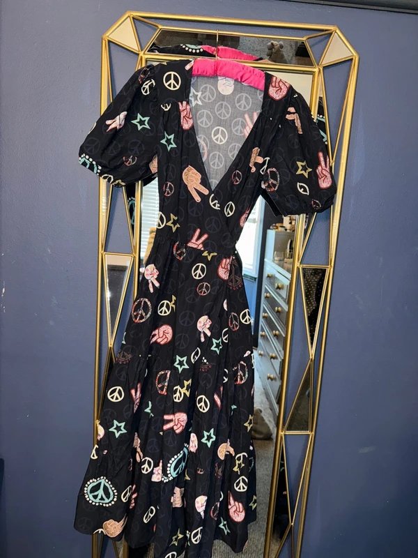The Never Fully Dressed Navy Peace Wrap Dress is available in sizes L.