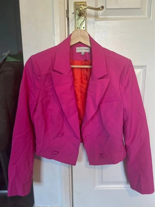 The Never Fully Dressed Pink Cropped Blazer is available in sizes S.