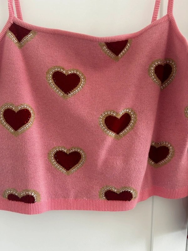 The pink heart tank top from Never Fully Dressed features a bright pink base with red heart motifs adorned with red sparkling studs. It combines a tank top and a selling cardigan made from the same knitted material.