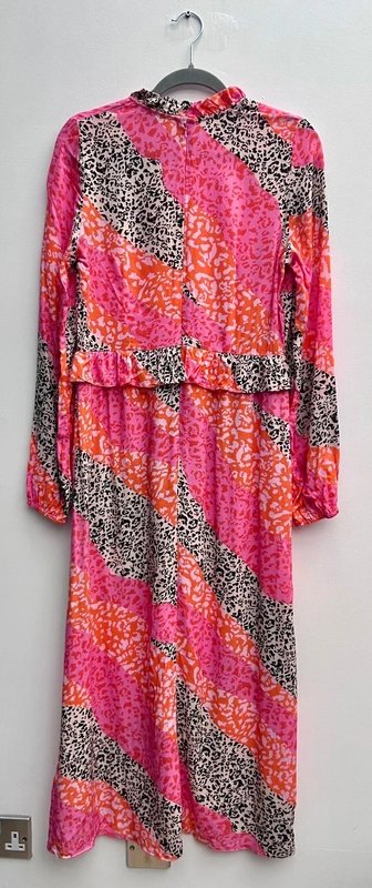 Playful midi dress in a bold pink and orange mixed leopard print. Features a high ruffle neckline, long sleeves with elastic cuffs, and a signature ruffle waist detail. Perfect for making a statement.