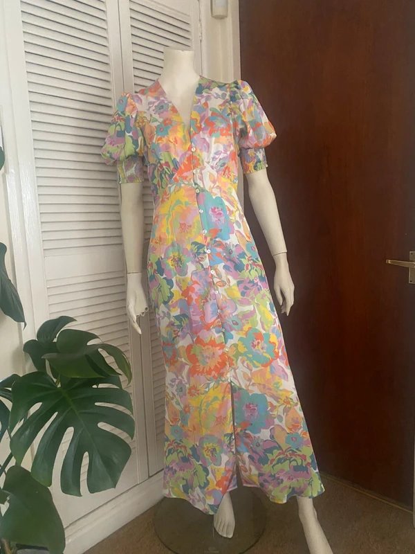 The Never Fully Dressed Floral Midi Dress with Elasticated Sleeves is available in sizes S.