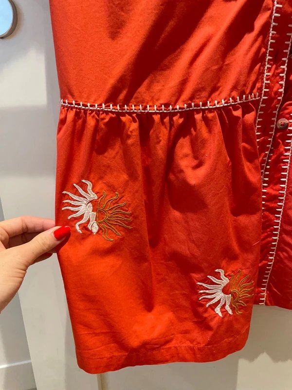 Beautiful 100% Cotton embroidered maxi dress with long sleeves. The dress features a button-up design and is in excellent condition. Perfect for an elegant evening out.