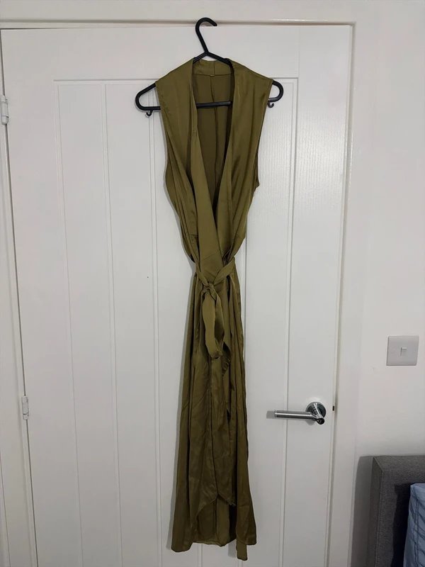 The Never Fully Dressed Satin Wrap Dress in Green is available in sizes S.