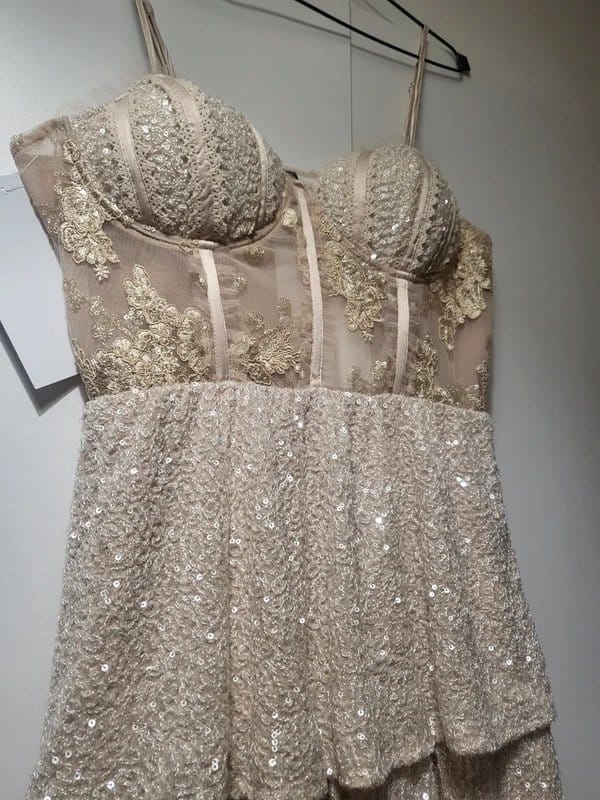 Beautiful cream dress with a sequin and lace design. It features a corset tiered silhouette and a maxi length, making it perfect for formal events.