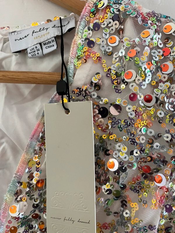 The Cream long sleeve scalloped hem fully lined dress from Never Fully Dressed is a beautiful piece that will fit sizes 6-8.