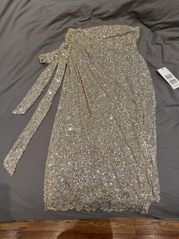 The Never Fully Dressed Gold Sequin Midi Wrap Skirt is available in sizes L.