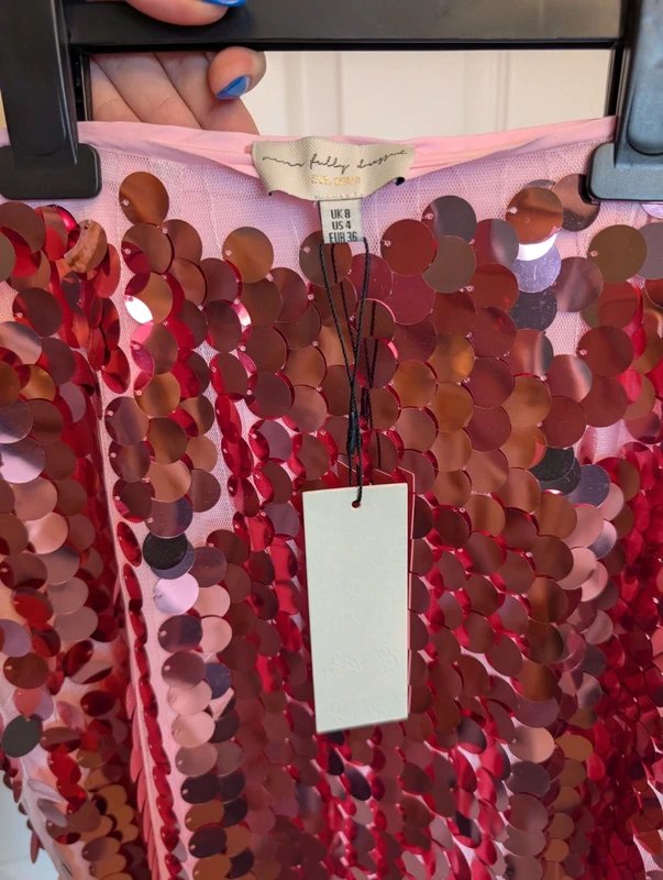 This Pink Sequin Skirt from Never Fully Dressed is a dazzling addition to your wardrobe. The skirt is adorned with sparkling sequins in various shades of red, creating a mesmerizing effect. The lightweight fabric ensures comfort while the high-rise waist provides a flattering fit. Perfect for a night out or a special occasion, this skirt is sure to turn heads.