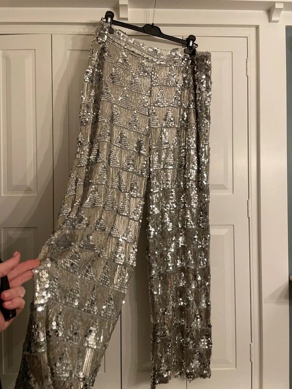 The Never Fully Dressed Silver Sequinned Wide Leg Trousers is available in sizes XXXL, XXL, XL, XS, L, M, S.