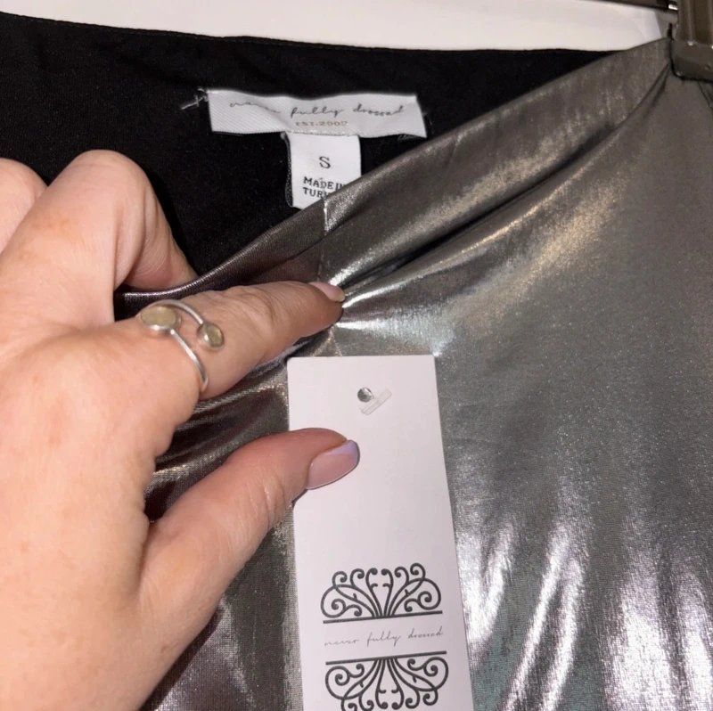 The Never Fully Dressed Bardot Flare Sleeve Layered Dress in silver is perfect for a festival or party. It features a flare sleeve and layered design that adds depth and dimension to the piece.