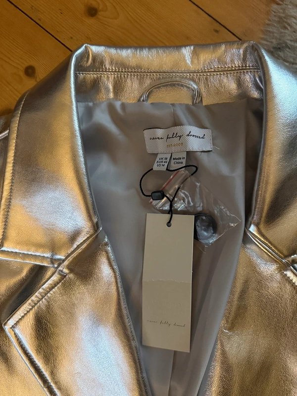 The Never Fully Dressed Silver Metallic Blazer is available in sizes L.