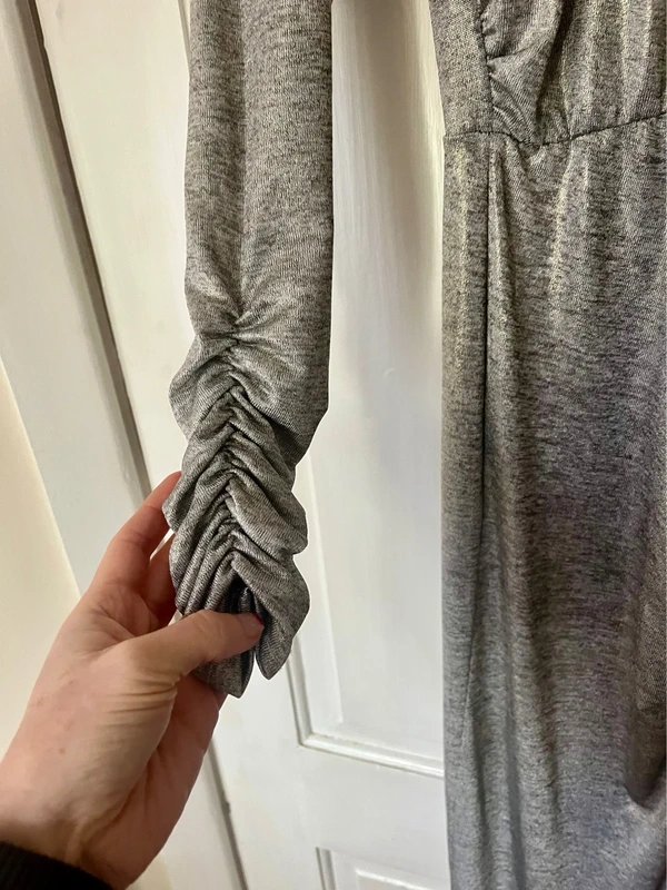 Gorgeous shimmering silver and gold dress. Designed in vibrant silver, this long-sleeve full-length dress features ruched waist and sleeves, a figure-hugging silhouette, and a thigh split for a dramatic touch. Crafted from stretchy ribbed fabric with a subtle shimmer, it catches the light beautifully. Perfect for party events and special occasions.