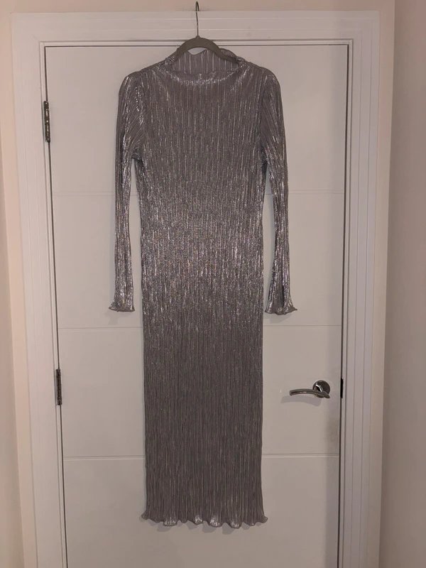 The Never Fully Dressed Elegant Long Sleeve Maxi Dress in Silver is made from plisse.