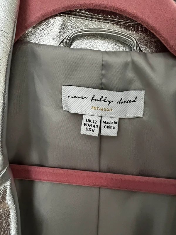 The Never Fully Dressed Silver Vegan Leather Jacket is available in sizes M.