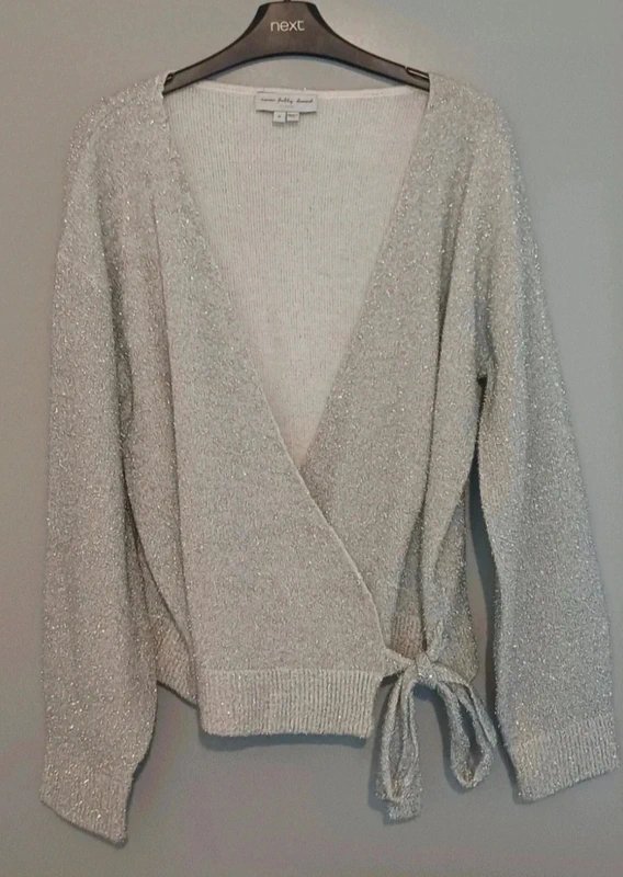 The Never Fully Dressed Silver Wrap Cardigan is available in sizes M.