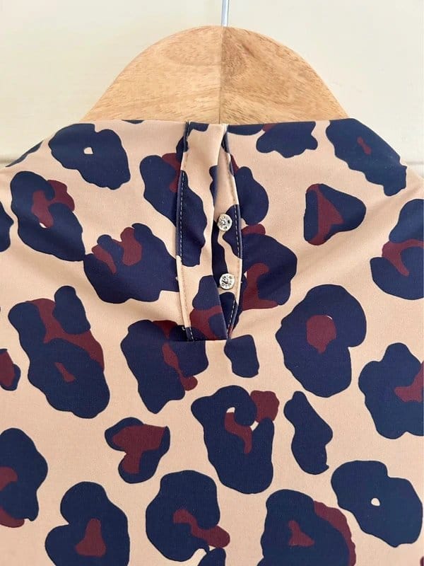 This animal print bodysuit by Never Fully Dressed features a bold leopard print in shades of beige, brown, and blue. Made from a stretchy fabric, it offers a form-fitting silhouette with a crew neckline and button placket. Perfect for adding a wild touch to your wardrobe.