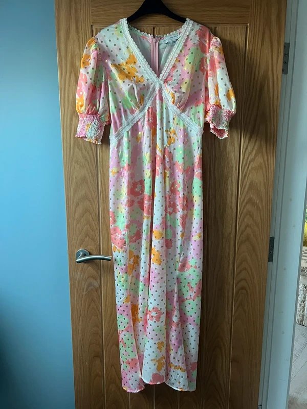 A stunning dress featuring floral prints and lace detailing, crafted with a soft fabric for a flattering fit.