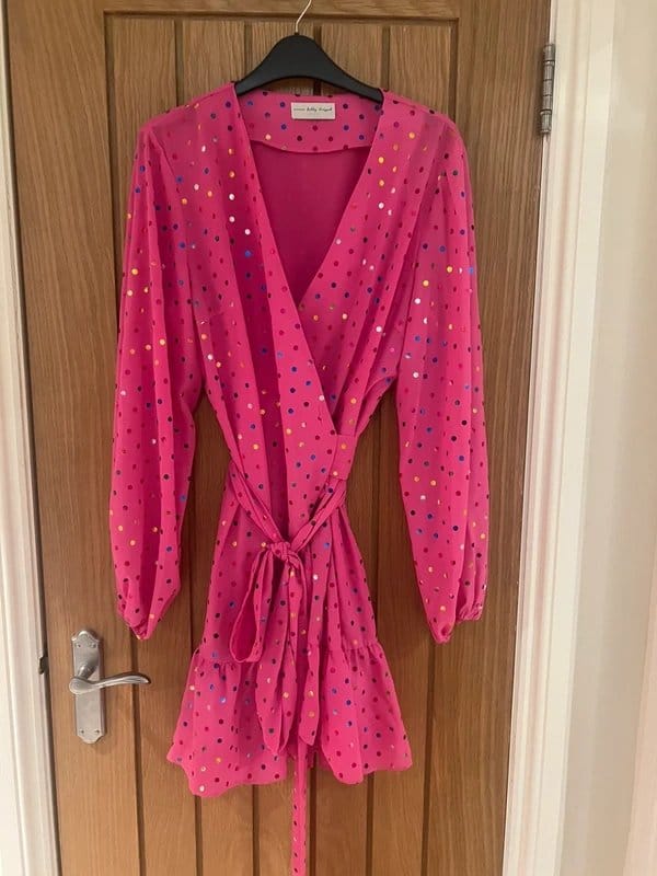 Vibrant pink wrap dress with a playful polka dot pattern and long sleeves. Perfect for a fun evening out or a party.