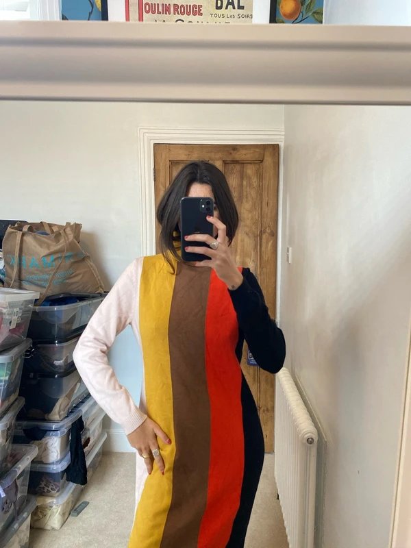 The Never Fully Dressed stripe knit midi dress is a vibrant statement piece. Crafted with a stripe design, this knit dress features a flattering midi length. Perfect for casual outings, it's a versatile addition to any wardrobe.