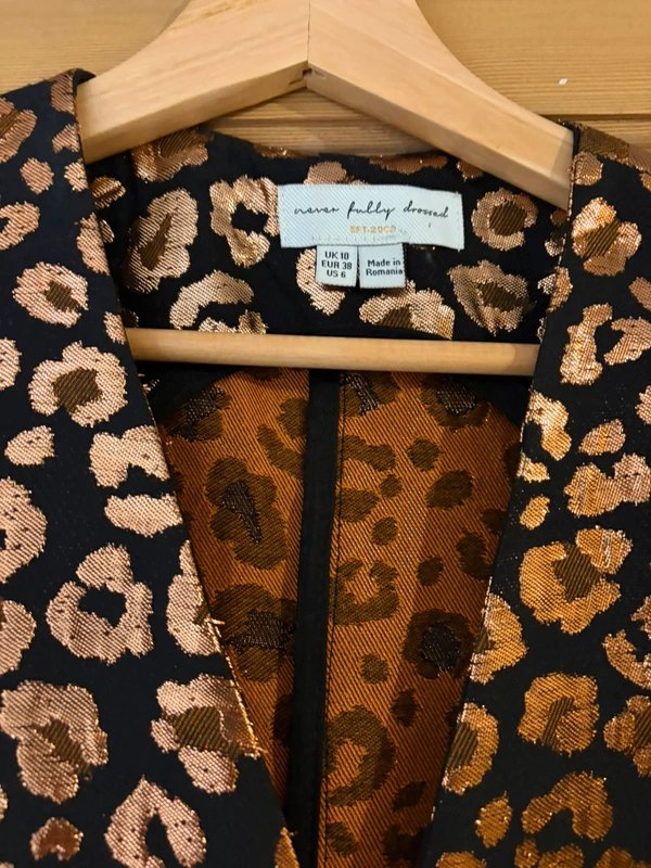 The Never Fully Dressed Gold Leopard Print Waistcoat is available in sizes S.