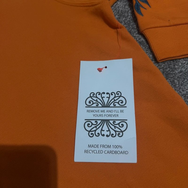Orange Embroidered Sweatshirt — the must-have casual top for everyday wear. Designed in vibrant orange, this long-sleeve sweatshirt features embroidered details and a crew neckline. Crafted from 100% recycled cardboard, it offers a lightweight and comfortable fit. Perfect for casual outings, this piece is a statement addition to any wardrobe.