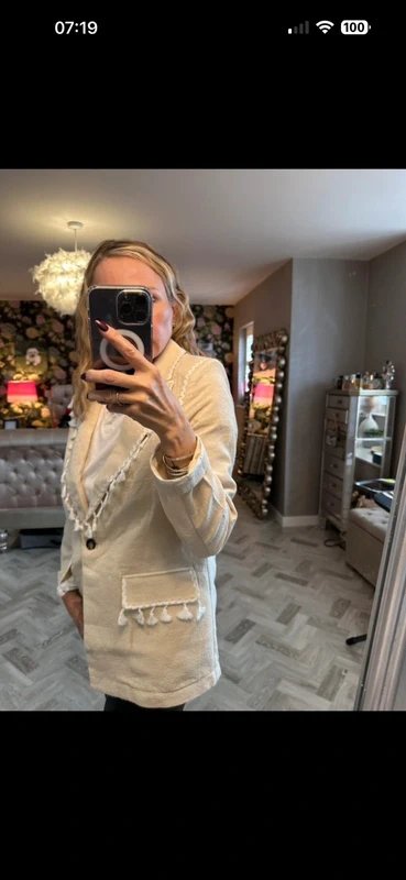 The Never Fully Dressed Beige Tassel Blazer is available in sizes M.