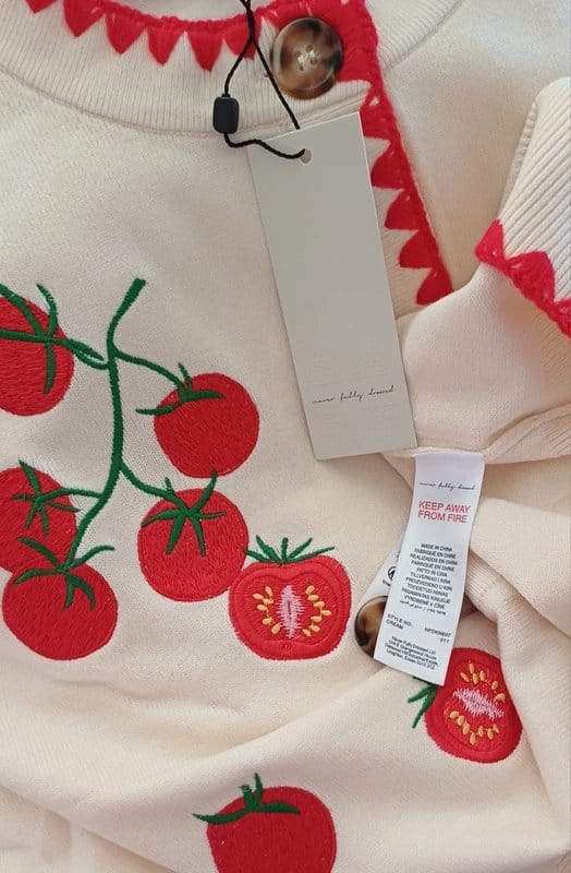 Charming embroidered knit cardigan in cream with playful red tomato details. Perfect for casual wear with a whimsical touch.
