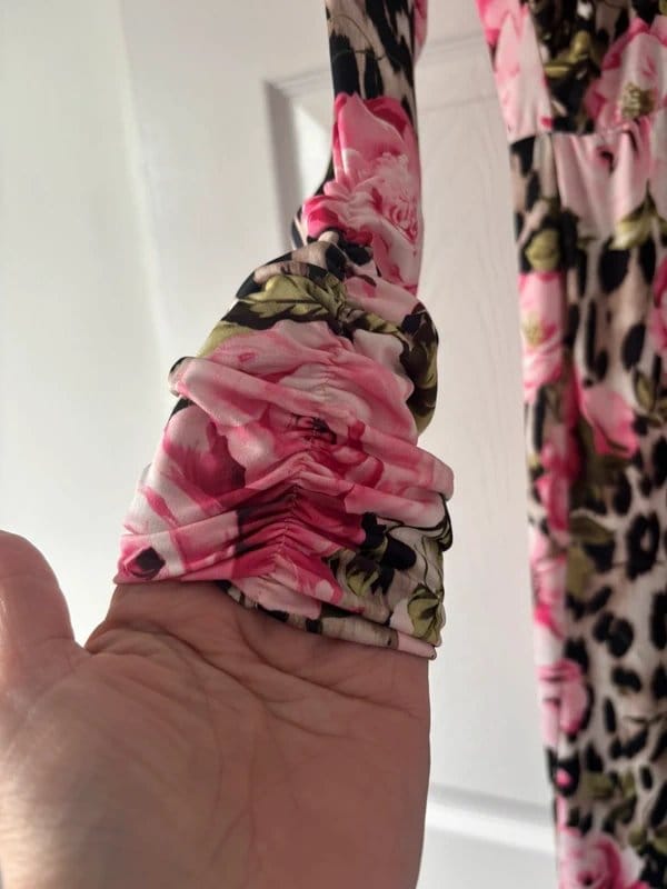 See all outfit ideasA stunning full-length floral dress by Never Fully Dressed. This dress features a ruched detail on the sleeves and a side split for added flair. Made from a stretch material, it offers a comfortable and flattering fit.