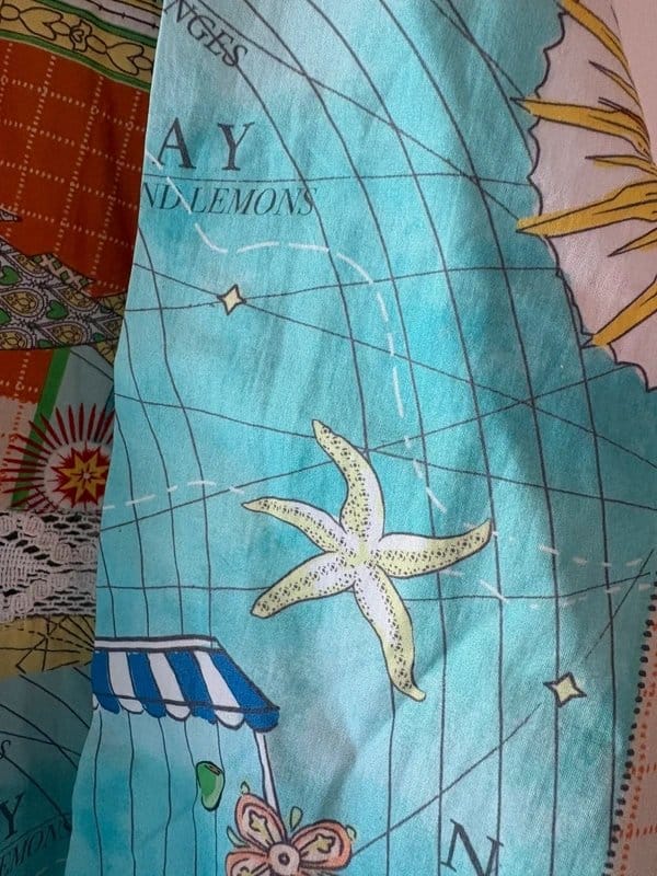 Never Fully Dressed presents a multi-coloured pyjama set with a cotton blend fabric. Featuring a map-like design with a starfish, beach scene, and a map grid, these pyjamas are perfect for a relaxed night in.