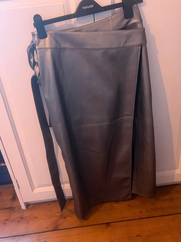 Gunmetal grey vegan leather wrap skirt by Never Fully Dressed. Features a faux suede lining and a wrap design that can fit sizes 8-12. Perfect for a sleek, modern look.