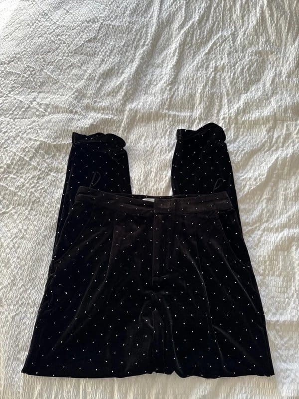 See all outfit ideasGorgeous statement piece featuring a waistcoat-style top with buttons and slim leg trousers with turn-up hems. Made from velvet fabric with a polka dot pattern, perfect for party wear and fancy dress occasions.