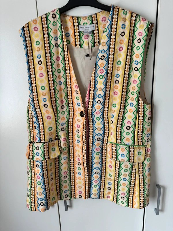 Vibrant multi-colored print waistcoat by Never Fully Dressed. This sleeveless waistcoat features a playful geometric pattern in a mix of yellow, orange, green, and blue. Crafted from a lightweight fabric, it offers a relaxed fit and is perfect for casual outings or adding a pop of color to your wardrobe.